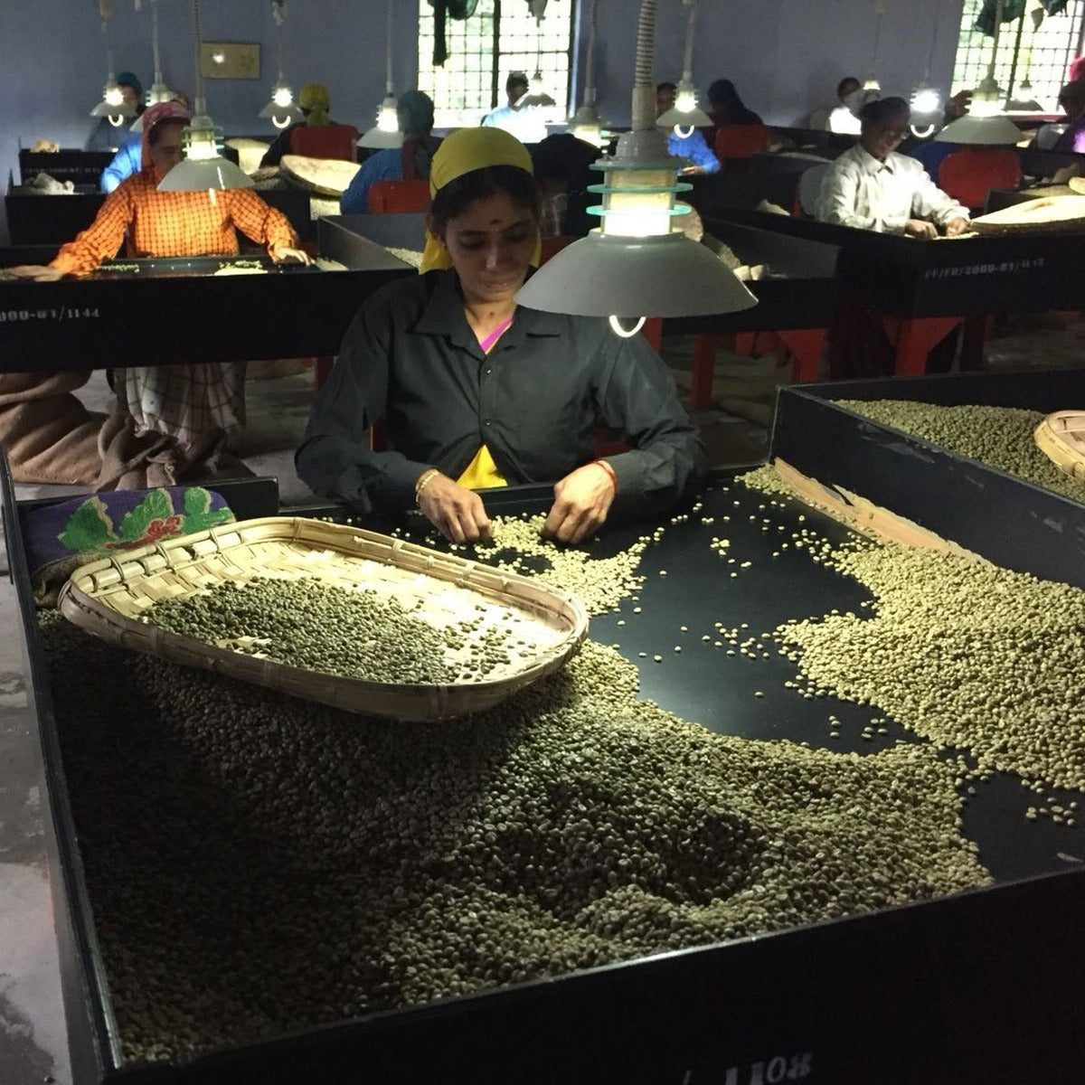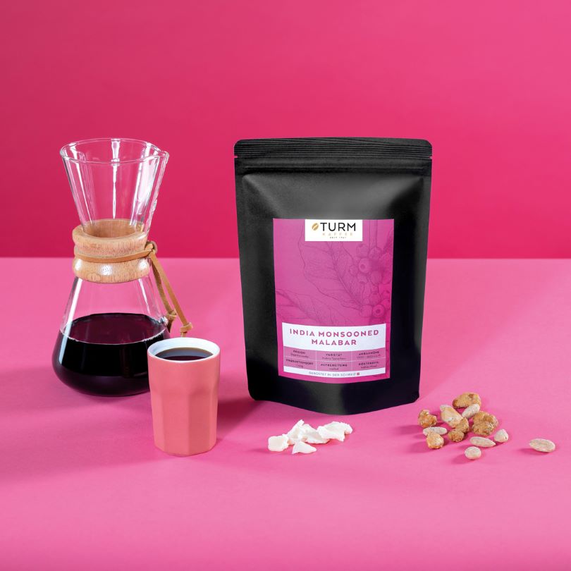 Unser Kaffee stammt aus der Region Coorg und wird im Schatten unter hohen Bäumen auf grossen Plantagen, sogenannten Estates, angepflanzt. Die roten Kirschen werden gepflückt und anschliessend während den Monaten des Monsuns von Juni bis September über Wochen in überdachten und zumeist offenen Hallen auf Gittern, der bis zu 90% hohen Luftfeuchtigkeit ausgesetzt. Dadurch quellen die Kirschen auf und auf natürliche Weise reduziert sich somit der Säuregehalt der Bohnen. Anschliessend werden die Bohnen auf 12% getrocknet, geschält und stehen für den Export bereit.